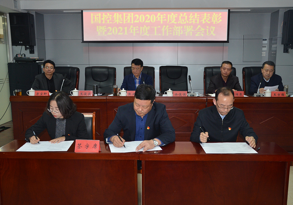 会议宣读了集团公司2020年度受表彰情况,就获得优秀的部室和员工进行了通报,并颁发了荣誉证书。按照2021年度工作部署要求,党委副书记、总经理徐俊儒代表集团公司逐一与各部室及子公司签订《2021年度绩效考核目标责任书》,层层压实责任,立下“军令状”。